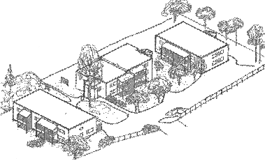 Talot ovat kaksikerroksisia, vaaleilla tiilillä verhoiltu, tasakattotaloja.